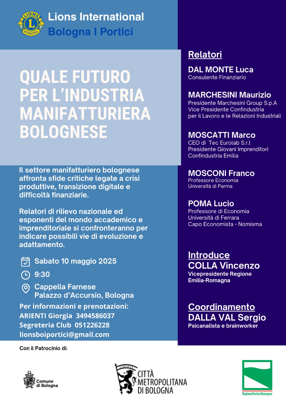 In programma per sabato 10 maggio a Bologna, presso la Cappella Farnese di Palazzo Accursio (Piazza Maggiore, 6), l’incontro “Quale futuro per l’industria manifatturiera bolognese” promosso da Lions Club Bologna I Portici.